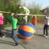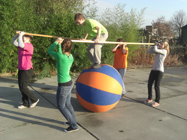 Op een grote bal van 1 meter hoog staat ƩƩn persoon. Om een parcours af te leggen moeten vier andere teamleden hem zo goed mogelijk ondersteunen en begeleiden met de ‘leuningen’.